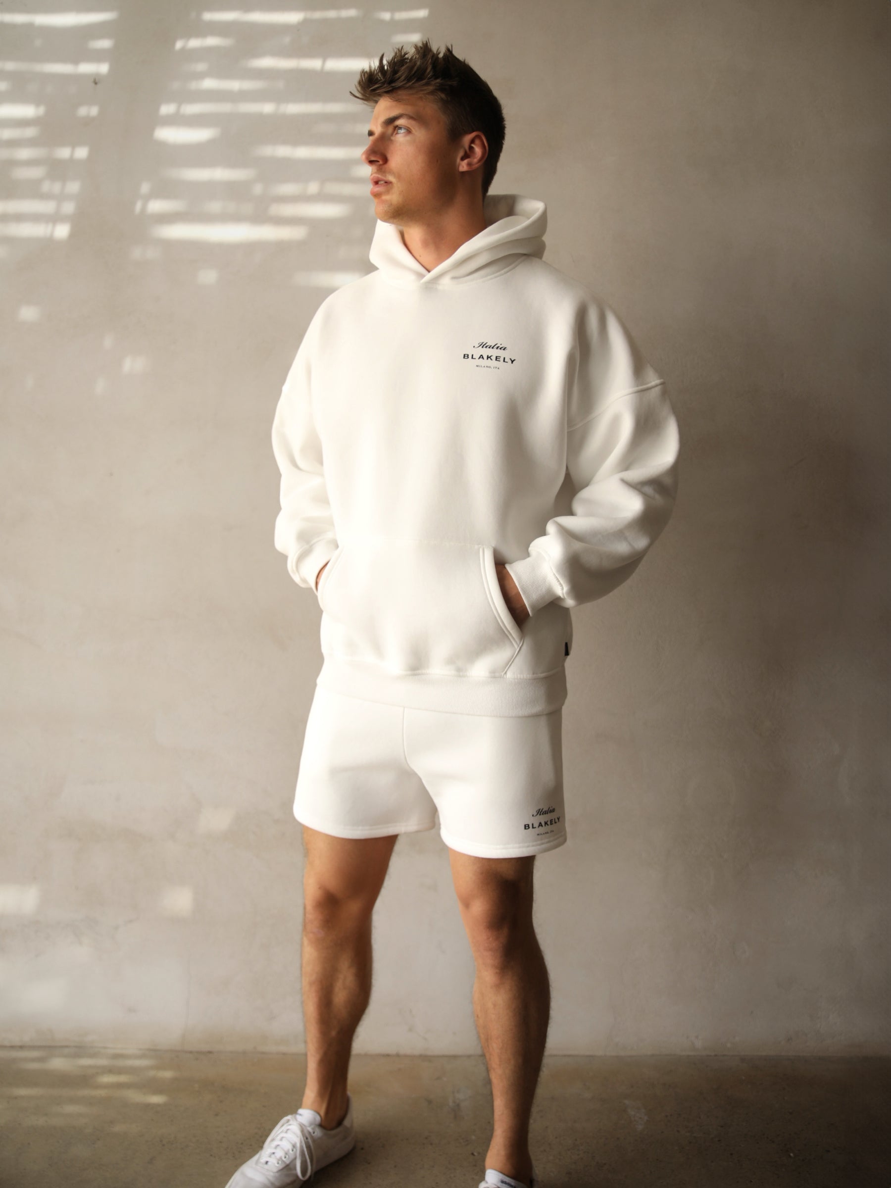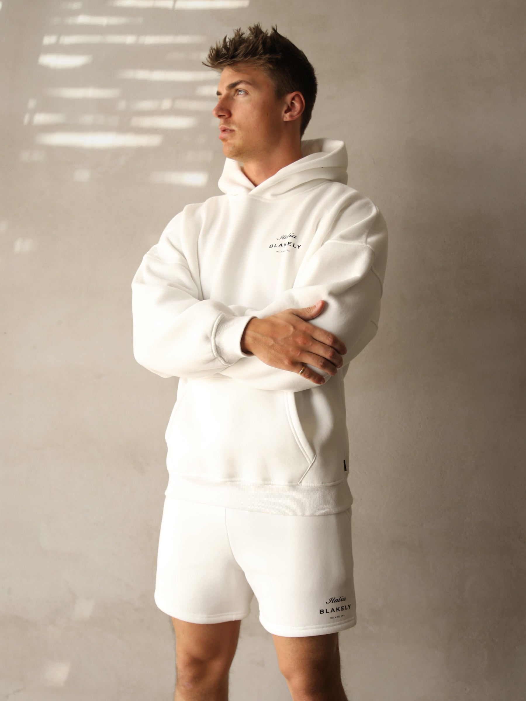 Part of this collection is our Italia Hoodie in flat white, this hoodie is crafted from a soft cotton blend with a relaxed fit. It has ribbed hem and cuffs and features our screen printed Italia graphic to the back and front.