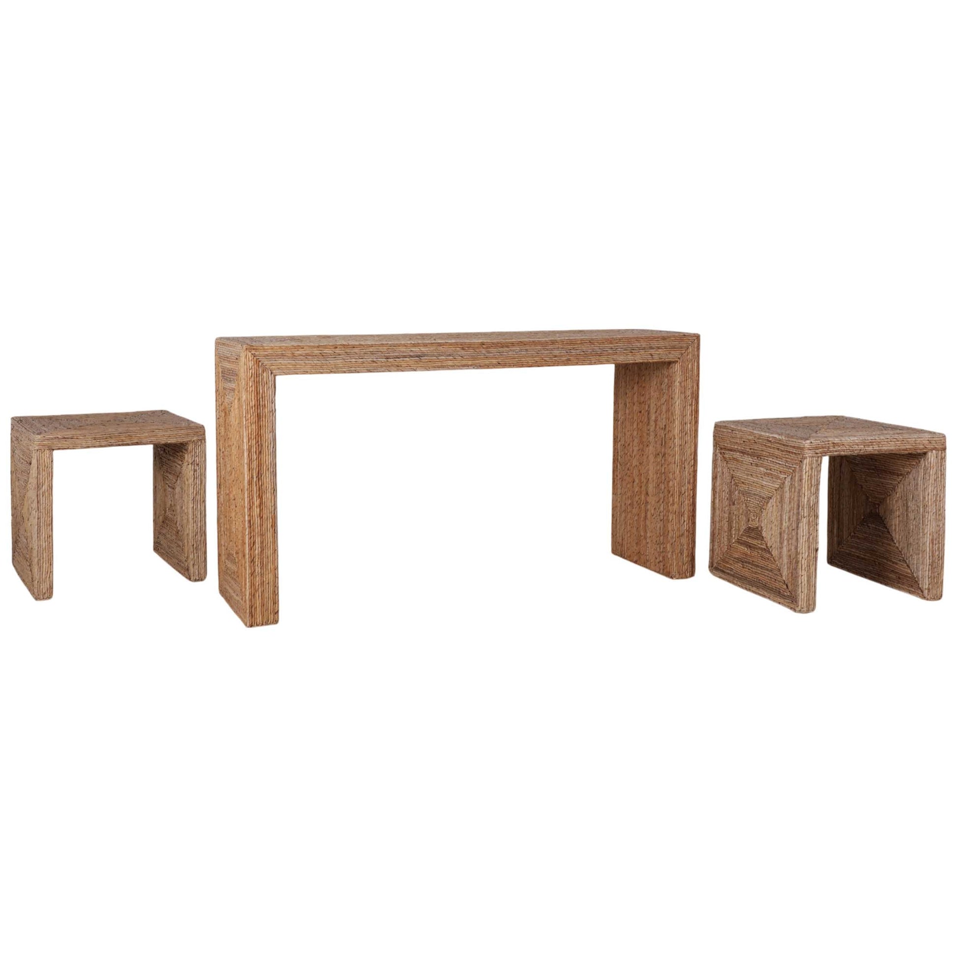 The Woven Console with Two Side Tables offers style, versatility, and space-saving design in one set. Crafted from a durable blend of banana and acacia wood, these three nesting tables feature warm tan and brown tones that highlight their natural texture and charm. Perfect for coastal and casual interiors, the woven wood design adds a touch of modern rustic elegance. Use them together as a striking console display or separately as side tables for added functionality. This set brings both practicality and timeless appeal to any room.